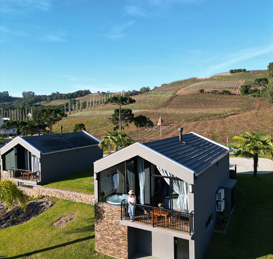 Nossa cabana exclusiva para casais é um refúgio único na região, perfeita para quem busca romance, tranquilidade e o charme do enoturismo. Com 80m² de área privativa, está imersa em 2 hectares de natureza, oferecendo total privacidade e uma vista espetacular para o pôr-do-sol. Somos a única cabana da região dedicada a receber apenas um casal por vez, proporcionando uma experiência intimista e personalizada. Localizada a menos de 15 minutos das principais vinícolas de Pinto Bandeira/RS, é o cenário ideal para momentos inesquecíveis a dois, em meio a vinhedos premiados e experiências autênticas com os melhores vinhos e espumantes da serra gaúcha.